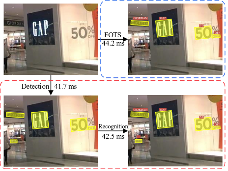 - Bài báo cung cấp một mô hình huấn luyện end-to-end phát hiện nhanh văn bản theo hướng. Bởi việc chia sẽ tính năng tích chập, mô hình có thể phát hiện và nhận dạng văn bản với ít phép tính hơn, điều này làm cho mô hình có thể chạy bởi thời gian thực.