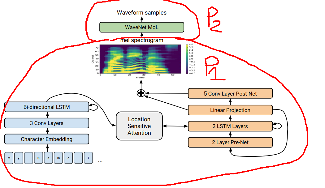 - Phần 1: Spectrogram Prediction Network - được dùng để chuyển đổi chuỗi kí tự (text) sang dạng mel-spectrogram ở frequency-domain
