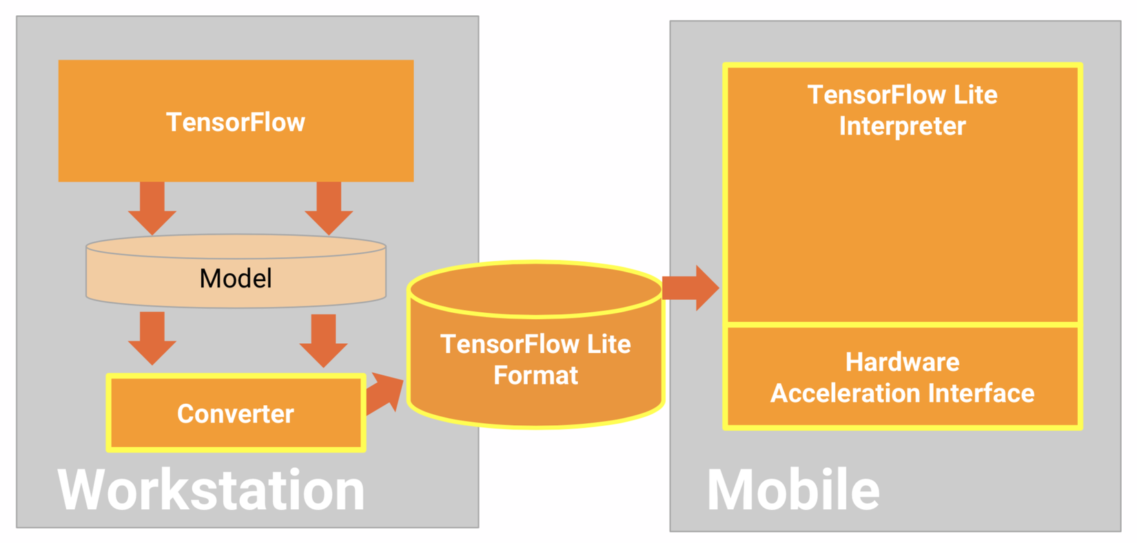 Vì đặc thù của các thiết bị như IoT, Mobile,.... là cấu hình phần cứng hạn chế,... nên không thể đưa hẳn một model AI lên App được mà cần phải xử lý để giảm kích thước của nó xuống, tiết kiệm được độ trễ xử lý, không gian bộ nhớ,.....TensorFlow Lite là phiên bản nhẹ hơn của TensorFlow cũng do Google phát triển. TensorFlow Lite được thiết kế để chạy các mô hình trên thiết bị di động và thiết bị nhúng. Như hình bên dưới đây :