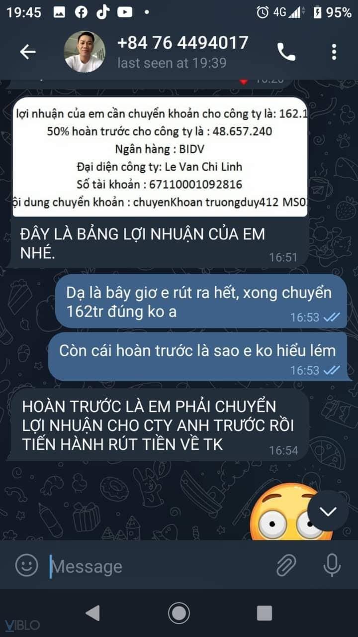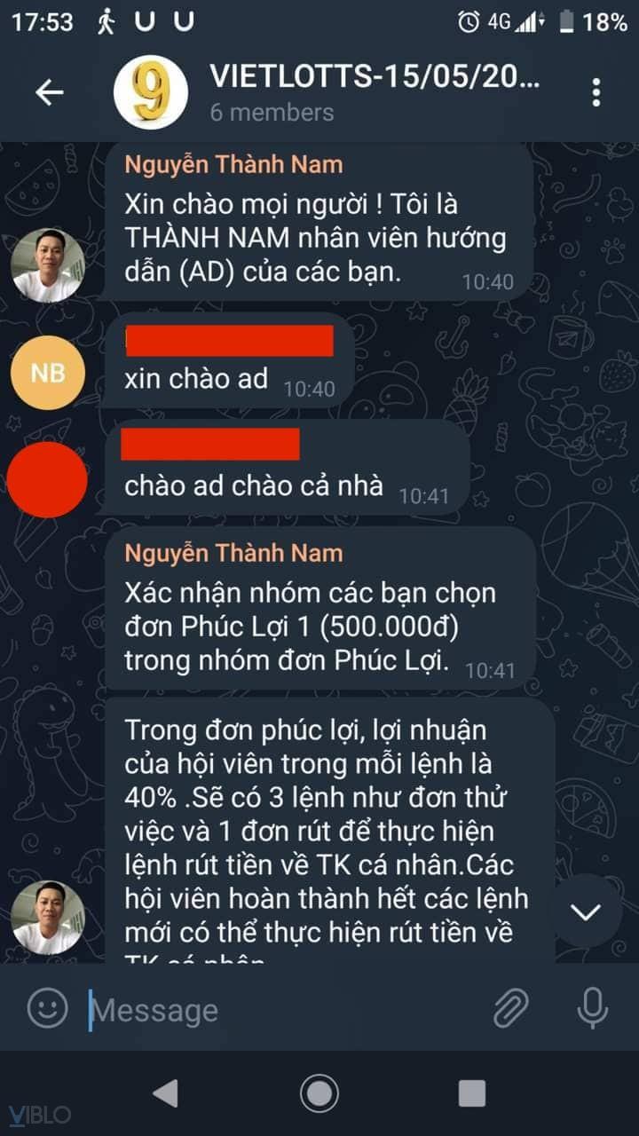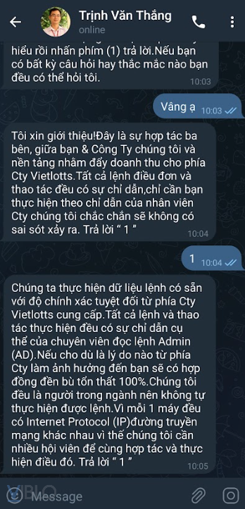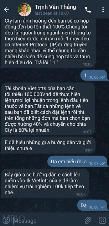 Tới đây chúng sẽ bắt đầu lộ rõ nanh vuốt ra. Lướt lên trên đi, tại chặng 1 chúng ta đã thấy bọn VIETLOTTS nói rằng công việc của chúng ta là tải app. Chỉ có tải app thôi và ăn 300 - 500k mỗi ngày. Nhưng sau khi hoàn thành nhiệm vụ trải nghiệm và chờ tiền về tài khoản thì chúng ta sẽ được yêu cầu liên hệ với đối tượng thứ 3 - một kẻ tự xưng là nhân viên điều đơn Trịnh Văn Thắng.