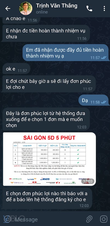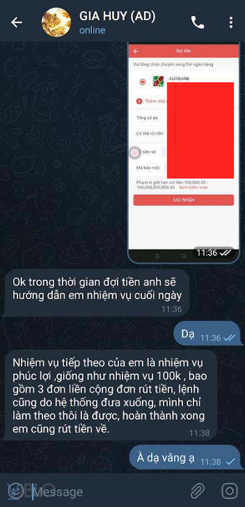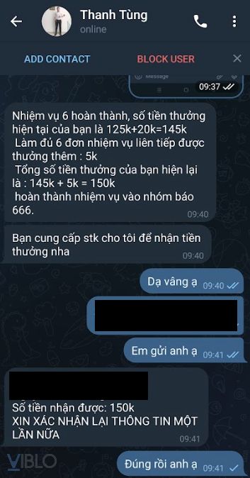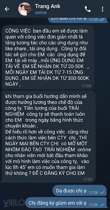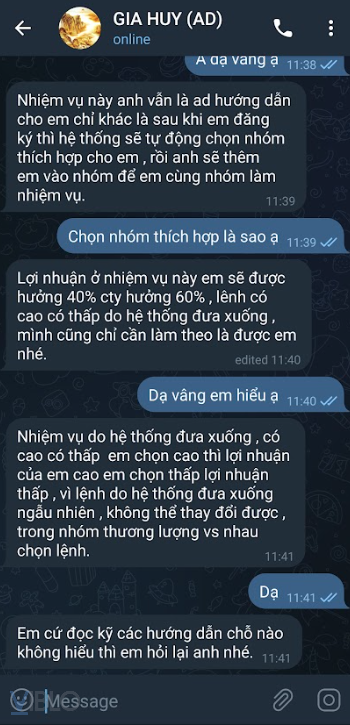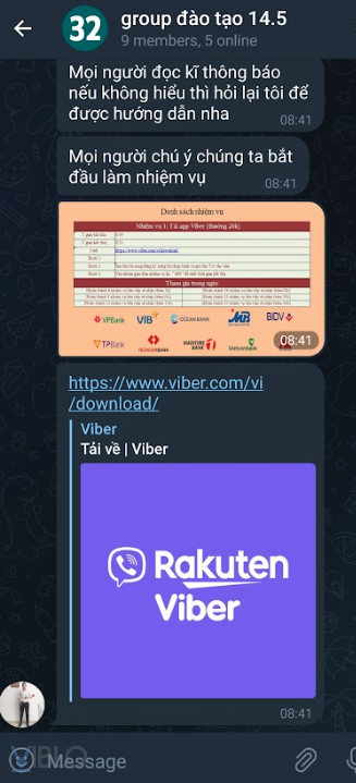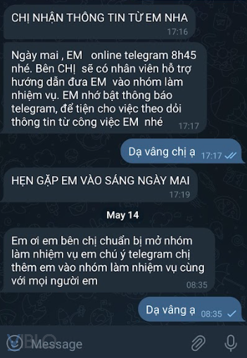 Sau khi tâm sự tha thiết một hồi thì nhân viên gọi điện sẽ yêu cầu chúng ta phải kết bạn liên hệ qua Telegram. Nhân viên này sau đó sẽ mô tả cho chúng ta nội dung công việc vô cùng đơn giản chỉ cần tải app theo yêu cầu là sẽ được tính tiền tươi thóc thật theo số lượng app. Để bắt đầu làm việc thì đối tượng sẽ yêu cầu chúng ta xác nhận đăng ký tham gia buổi đào tạo trải nghiệm trên Telegram. Buổi trải nghiệm này sẽ diễn ra vào 8h45 sáng các ngày.