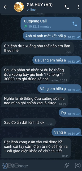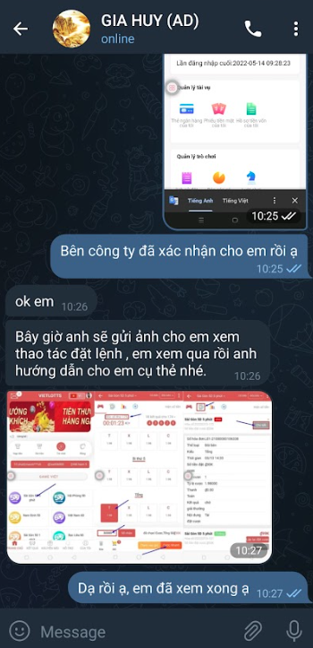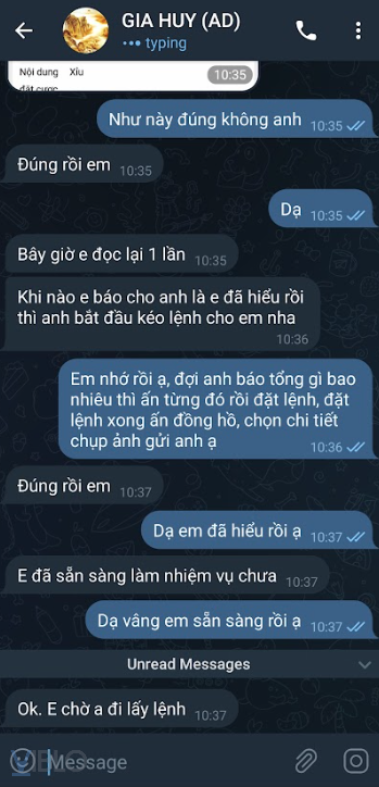 Như chúng ta đã thấy qua giao diện trang web đặt lệnh ở phần trên rồi, chỉ là chơi mấy trò cờ bạc vớ vẩn chứ lệnh liếc gì ở đây. Tại giai đoạn đặt lệnh chính thức này thì chúng ta sẽ làm việc với AD (Admin) Gia Huy. AD sẽ hướng dẫn chúng ta cách "đặt lệnh".