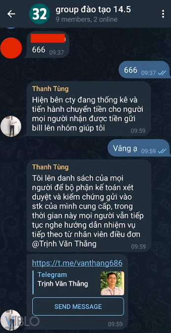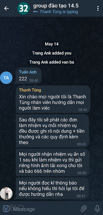 Sau khi xác nhận thì chúng ta sẽ được add vào nhóm trải nghiệm. Tới giờ hoàng đạo thì một đối tượng khác với tên Telegram Thanh Tùng tự xưng là nhân viên hướng dẫn sẽ xuất hiện và đưa ra chỉ dẫn làm công việc "trải nghiệm".