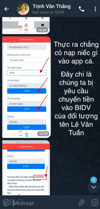 - Dấu hiệu 4: chẳng có hệ thống nạp rút tiền gì. Mọi yêu cầu nạp tiền - rút tiền đều phải thông qua tài khoản ngân hàng thứ 3 làm trung gian. Vì thế nên sau khi đưa yêu cầu nạp rút bọn lừa đảo mới yêu cầu chụp màn hình gửi lại. Vì nếu chúng ta không gửi thông tin thì đến bố chúng nó cũng chẳng biết tiền về thì phải tăng số cho tài khoản nào.