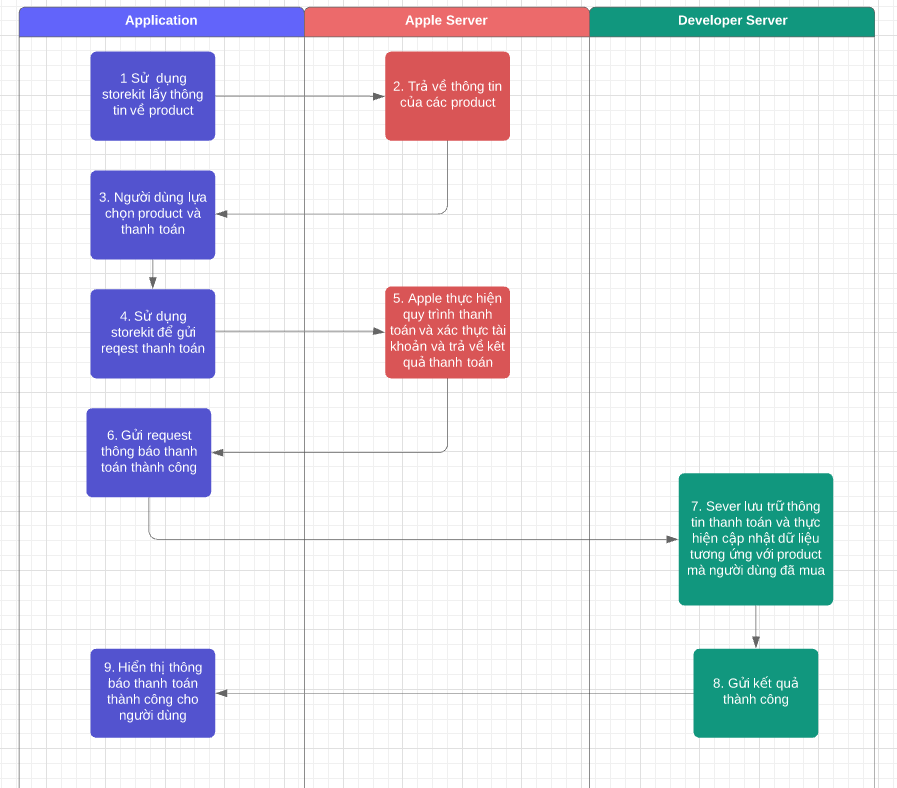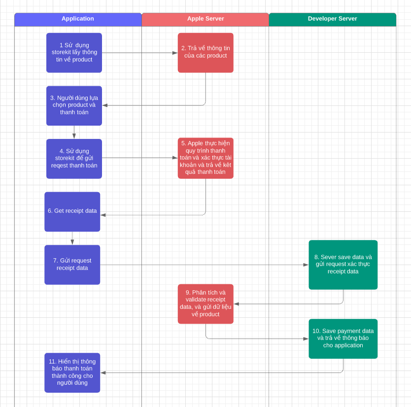 Sau khi thanh toán thành công, phía application sẽ lấy data và gửi lên cho phía developer server, data này sẽ được xác thực bởi apple nên nó không thể giả mạo và qui trình thanh toán của chúng ta sẽ trở nên an toàn hơn. Các bạn có thể tham khảo chi tiết cách triển khai ở đây