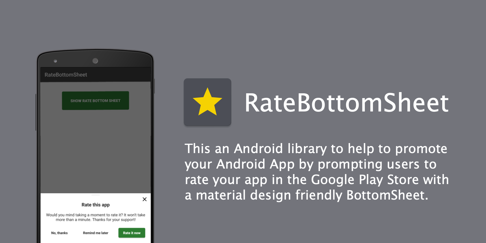 Như bạn có thể biết, Google đã phát hành một API mới để đánh giá trong ứng dụng. Nó thực sự tuyệt vời nhưng chỉ hoạt động từ API 21. Nếu vì một số lý do, bạn không thể sử dụng API này, bạn có thể thử thư viện RateBottomSheet. Nó hỗ trợ API 16+ và được thiết kế tốt. Dự án chứa một ứng dụng mẫu, có tài liệu được viết tốt và được release theo license Apache 2.0.