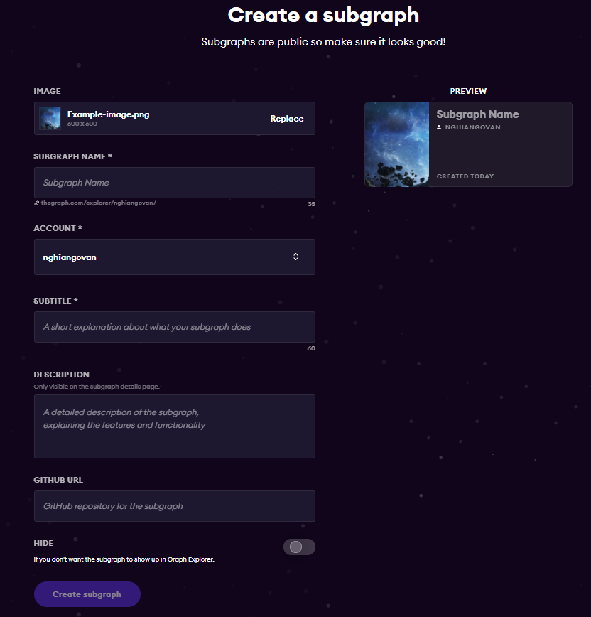 Và điền các thông tin về subgraph chi tiết các fields tại (create-the-subgraph)