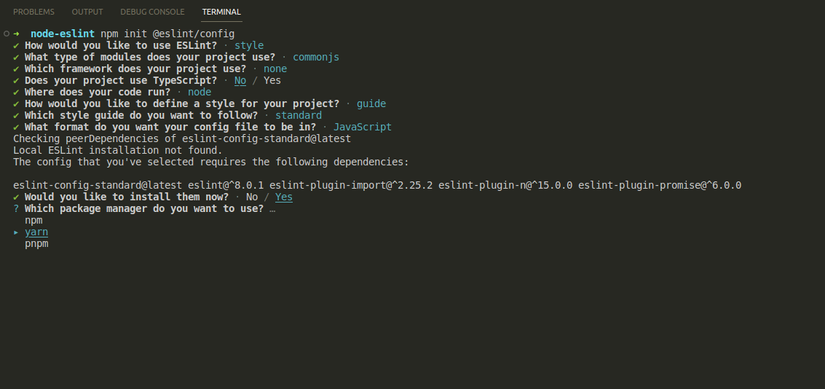 Chọn Yes để cài đặt các package hỗ trợ cho ESLint.