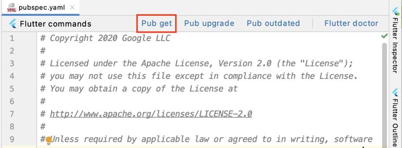 Nhấp vào Pub get để cài đặt plugin trong dự án Awesome Drawing Quiz.