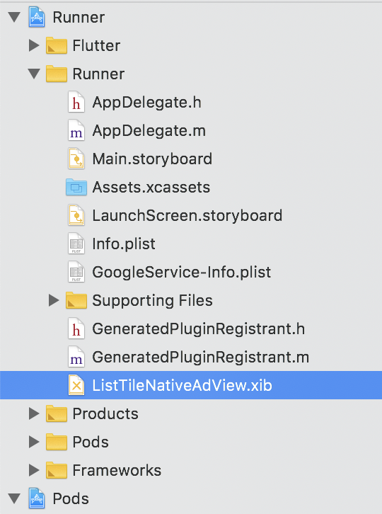 Mở tệp AppDelegate.m và đăng ký ListTileNativeAdFactory với chuỗi ID duy nhất (listTile) bằng cách gọi phương thức FLTGoogleMobileAdsPlugin.registerNativeAdFactory().