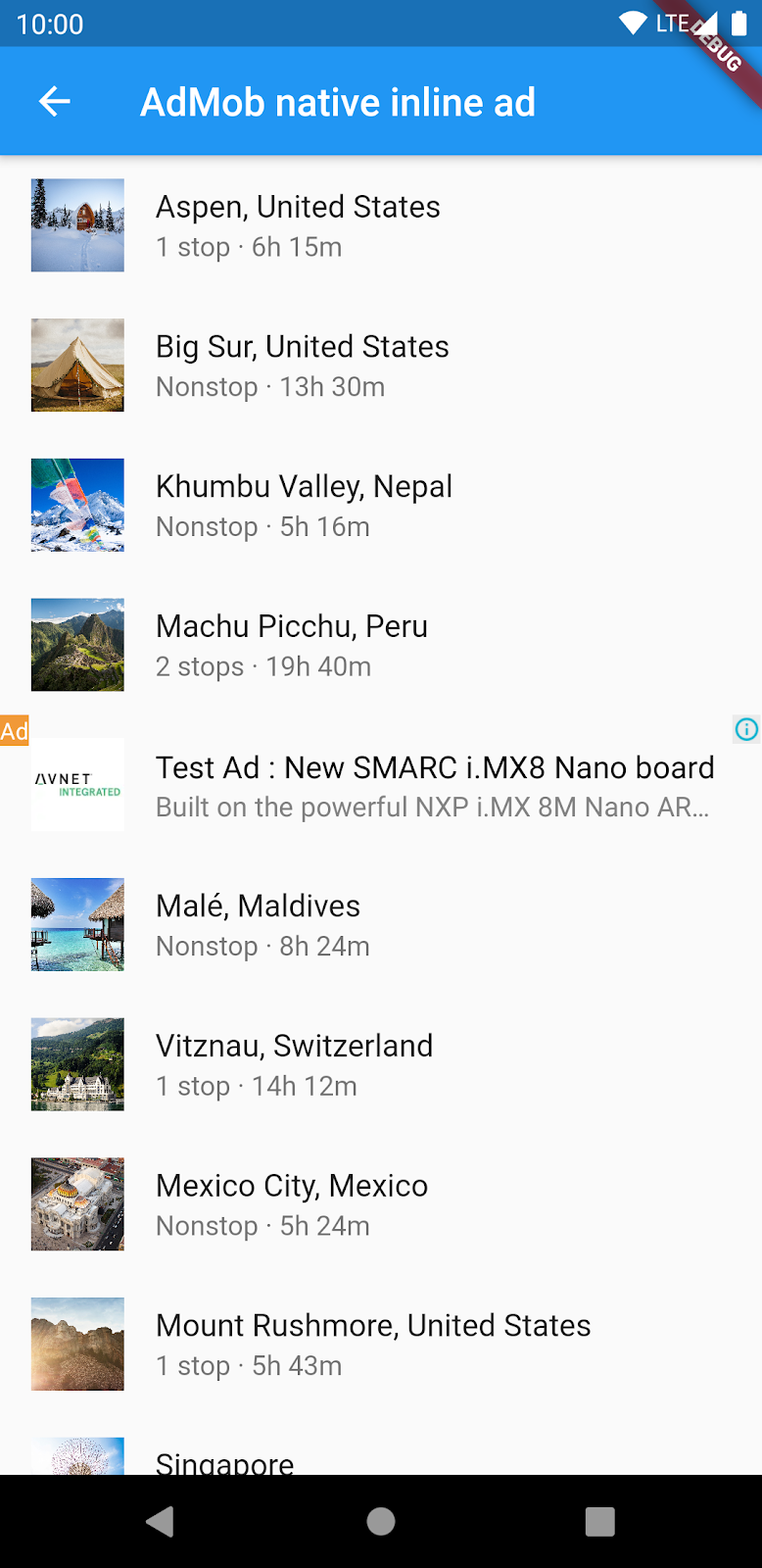 Vậy là xong! Chạy dự án và nhấp vào nút Native inline ad từ trang chủ. Sau khi quảng cáo được tải, bạn sẽ thấy quảng cáo gốc ở giữa danh sách.