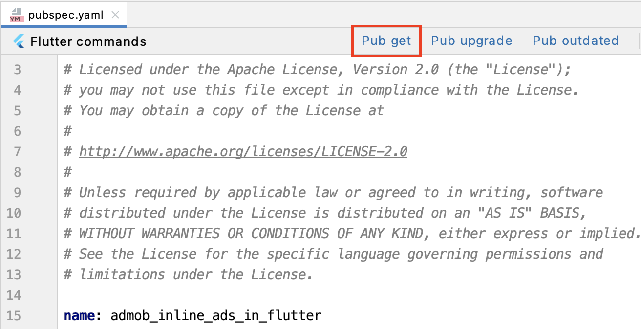 Nhấp vào Pub get để cài đặt plugin trong dự án AdMob inline ads.