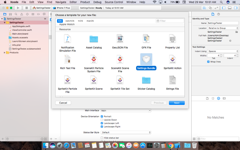 - Chọn Resource trong mục iOS, và chọn Settings Bundle template.