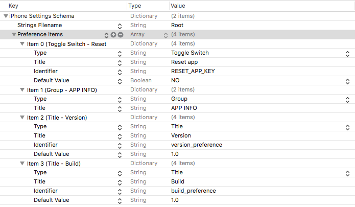 Preference items là một array chứa các dictionary controls. Đi tới Hình 1 để biết tất cả các Control mà chúng ta có thể thêm vào trong settings app bundle. Đối với ứng dụng demo này, tôi chỉ cần một nhóm, một tiêu đề để hiển thị số phiên bản ứng dụng, một tiêu đề để hiển thị số bản dựng và một công tắc bật tắt để đặt lại ứng dụng. Vì vậy, hãy xóa tất cả các mục trong array preference items và thêm các mục được đề cập ở trên.