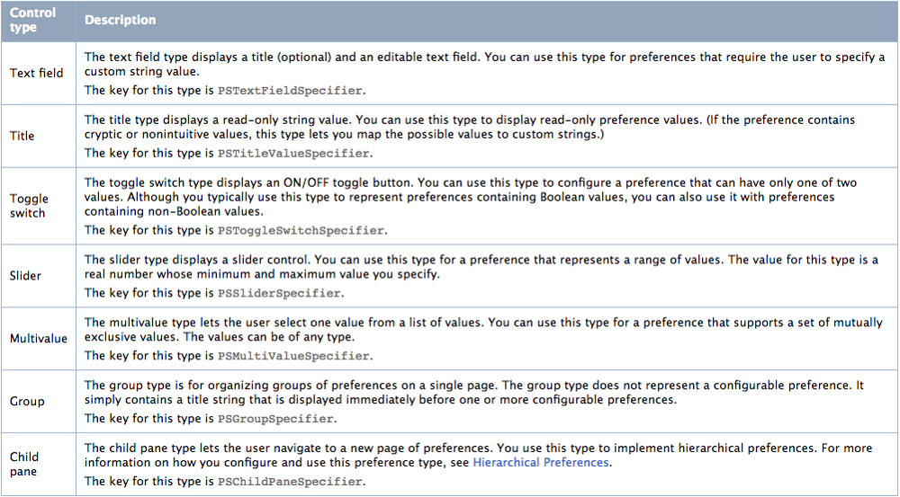Bảng dưới đây chứa danh sách các Control Type bạn có thể sử dụng trong settings.bundle