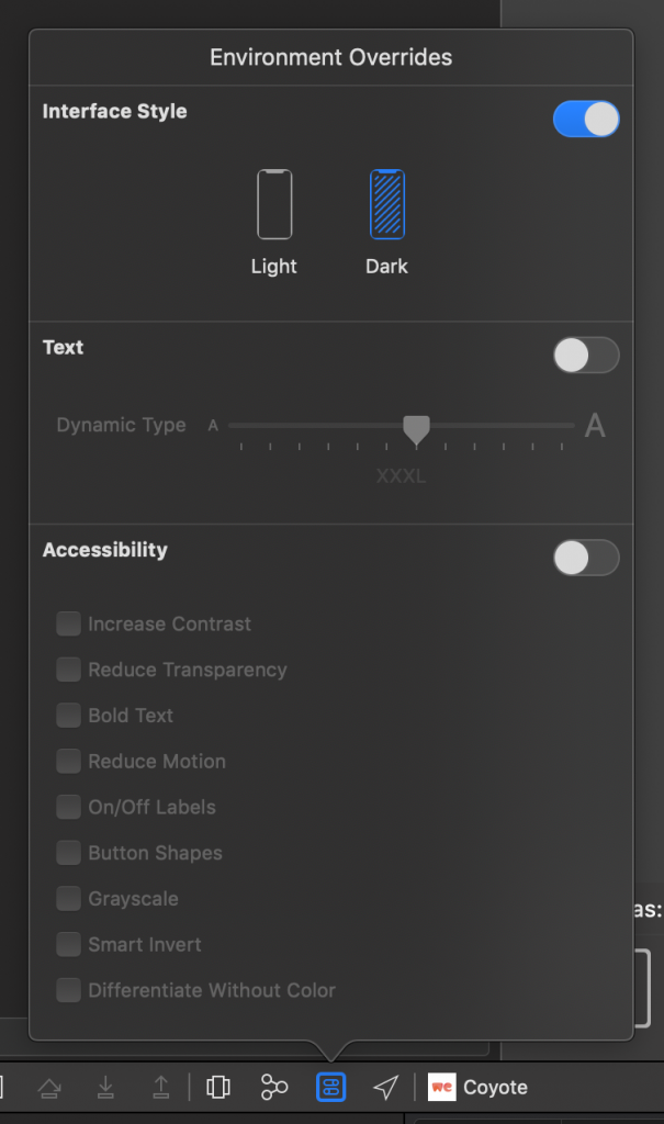 Khi làm việc trong Xcode với trình giả lập mở, bạn có thể muốn sử dụng cửa sổ ghi đè môi trường thay thế. Điều này cho phép bạn nhanh chóng chuyển đổi ngoại hình trong khi gỡ lỗi: