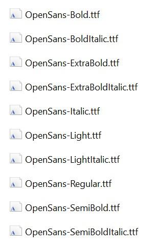 - Ở đây mình ví dụ một font rất phổ biến Open Sans, font tuy rất đẹp nhưng chỉ có khoảng 5 styles: Light (300), Regular (400), Semi-Bold (600), Bold (700), Extra-Bold (800) khi tải về bạn sẽ nhận được các file như sau.