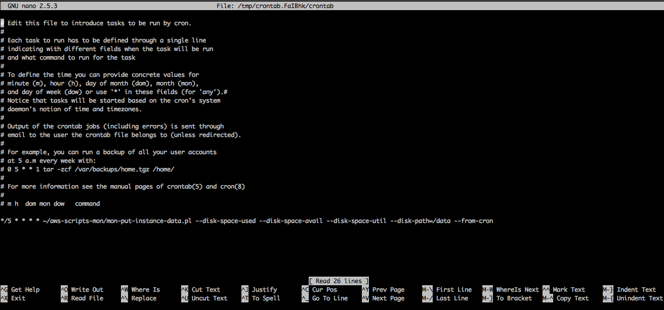 */5 * * * * ~/aws-scripts-mon/mon-put-instance-data.pl --disk-space-util --disk-space-used --disk-space-avail --disk-path=/data --from-cron