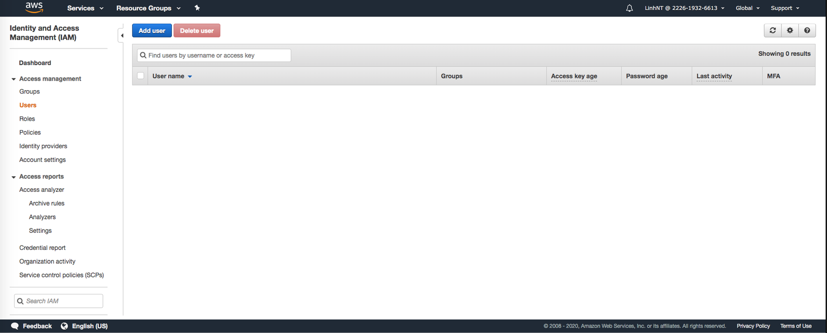Nếu chưa có chúng ta có thể đăng nhập vào AWS web console, sau đó vào mục Users trong IAM service và thêm nó vào. Cái này các bạn có thể tham khảo rất nhiều trên google.