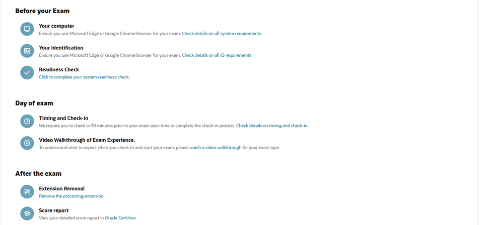 • Cấu hình thiết bị: Nếu bạn chọn thi trực tuyến, hãy chắc chắn rằng máy tính của bạn đáp ứng các yêu cầu về phần cứng và phần mềm của Oracle, bao gồm kết nối mạng ổn định và webcam hoạt động. • Quy định về kiểm tra: Bài thi online thường được giám sát qua webcam và microphone. Hãy kiểm tra kỹ các quy định về môi trường thi cử, chẳng hạn như không được phép sử dụng tài liệu hoặc thiết bị hỗ trợ.