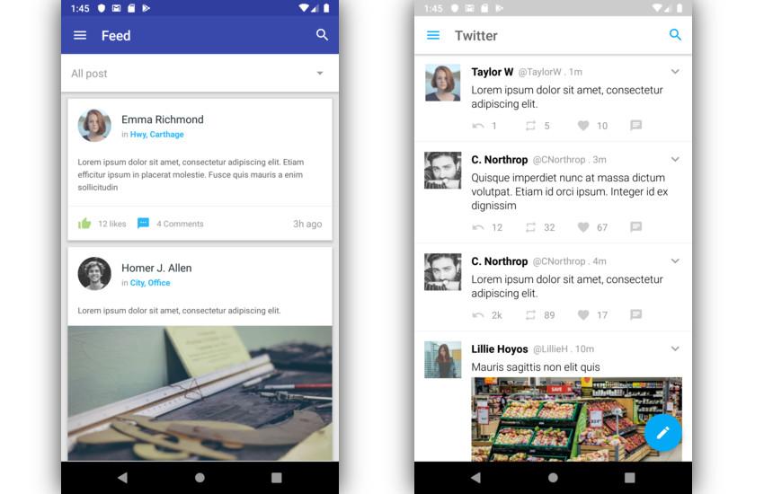 Ngoài ra, MaterialX có bố cục để hiển thị nguồn cấp dữ liệu và thời gian của người dùng. Nếu bạn đang cố gắng thực hiện chức năng giống như Twitter trong ứng dụng của mình, bạn sẽ thấy những bố cục này cực kỳ hữu ích.