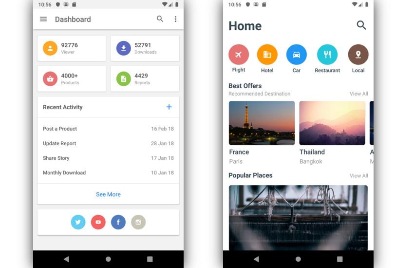 Bảng điều khiển trực quan hiển thị nhiều dữ liệu tùy chọn theo ngữ cảnh và kịp thời có thể là màn hình chính lý tưởng cho nhiều loại ứng dụng, chẳng hạn như ứng dụng thể dục, ứng dụng du lịch và ứng dụng liên quan đến tiền điện tử. MaterialX hiện có 11 bảng điều khiển, mỗi bảng nhắm đến các mục tiêu khác nhau. Ví dụ: đây là hai bố cục bảng điều khiển, một cho ứng dụng Thương mại điện tử và một cho ứng dụng du lịch: