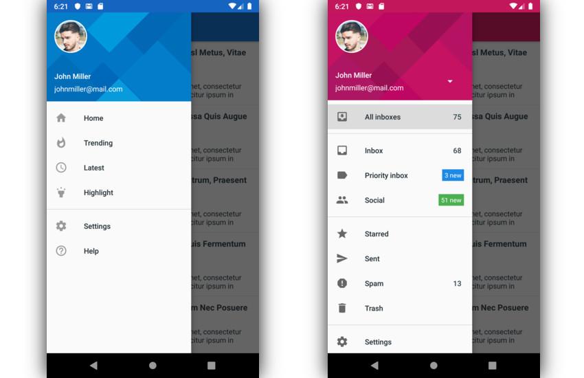 Nếu bạn thích sử dụng ngăn kéo trượt thay vào đó, mẫu này cung cấp cho bạn một số tùy chọn, tất cả đều hướng đến các loại ứng dụng khác nhau. Ví dụ: nếu bạn đang xây dựng một ứng dụng tin tức, bạn có thể sử dụng thành phần Ngăn kéo Tin tức. Tương tự, nếu bạn đang tạo một ứng dụng liên quan đến thư, bạn có thể sử dụng thành phần Ngăn kéo Thư.