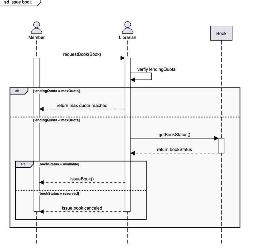 Sơ đồ tuần tự (Sequence diagrams) là một cách tuyệt vời để hiểu các tương tác giữa các thực thể (entities) và đối tượng (objects) khác nhau trong hệ thống. Chúng ta có thể tạo ra các sơ đồ tuần tự khác nhau cho hệ thống quản lý thư viện của mình. Vì bài viết khá dài nên mình chỉ làm một sequence diagram: Thành viên yêu cầu thủ thư cho mượn sách.