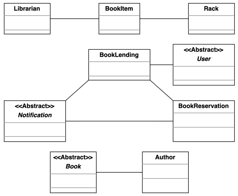 - Cả RackvàLibrarianđều có mối liên kết hai chiều vớiBookItem.