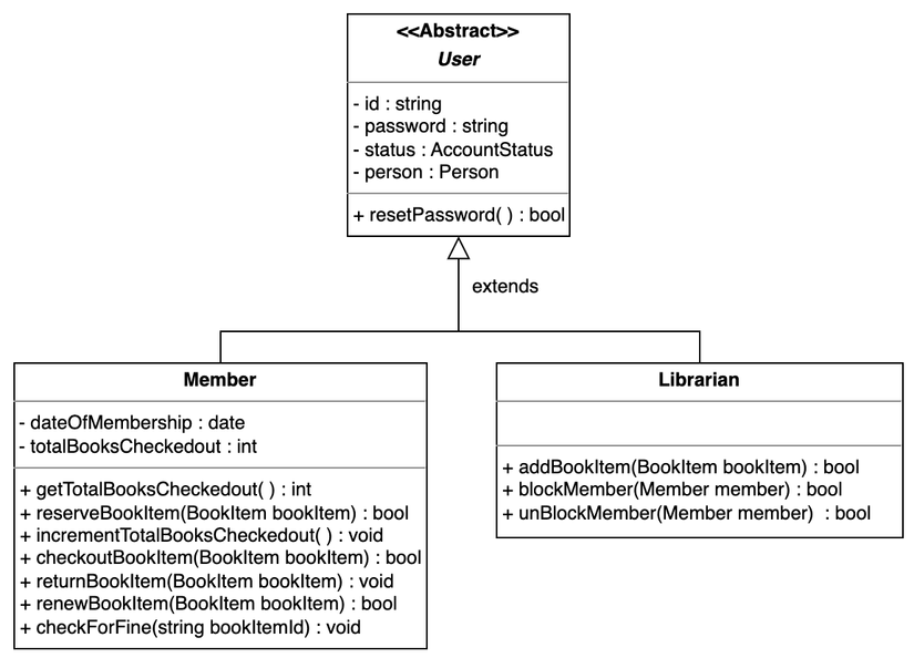 Cấu trúc phân cấp của các classes này được minh họa trong một class diagram, cho thấy mối quan hệ giữa các class User, Librarian, và Member.