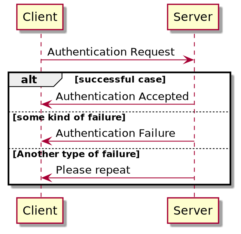 @startumlparticipant Clientparticipant ServerClient -> Server: Authentication Requestalt successful caseServer -> Client: Authentication Acceptedelse some kind of failureServer -> Client: Authentication Failureelse Another type of failureServer -> Client: Please repeatend@enduml |