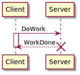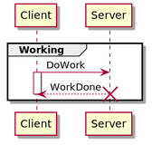 @startumlparticipant Clientparticipant Servergroup WorkingClient -> Server: DoWorkactivate ClientServer --> Client: WorkDonedestroy Serverdeactivate Clientend@enduml |