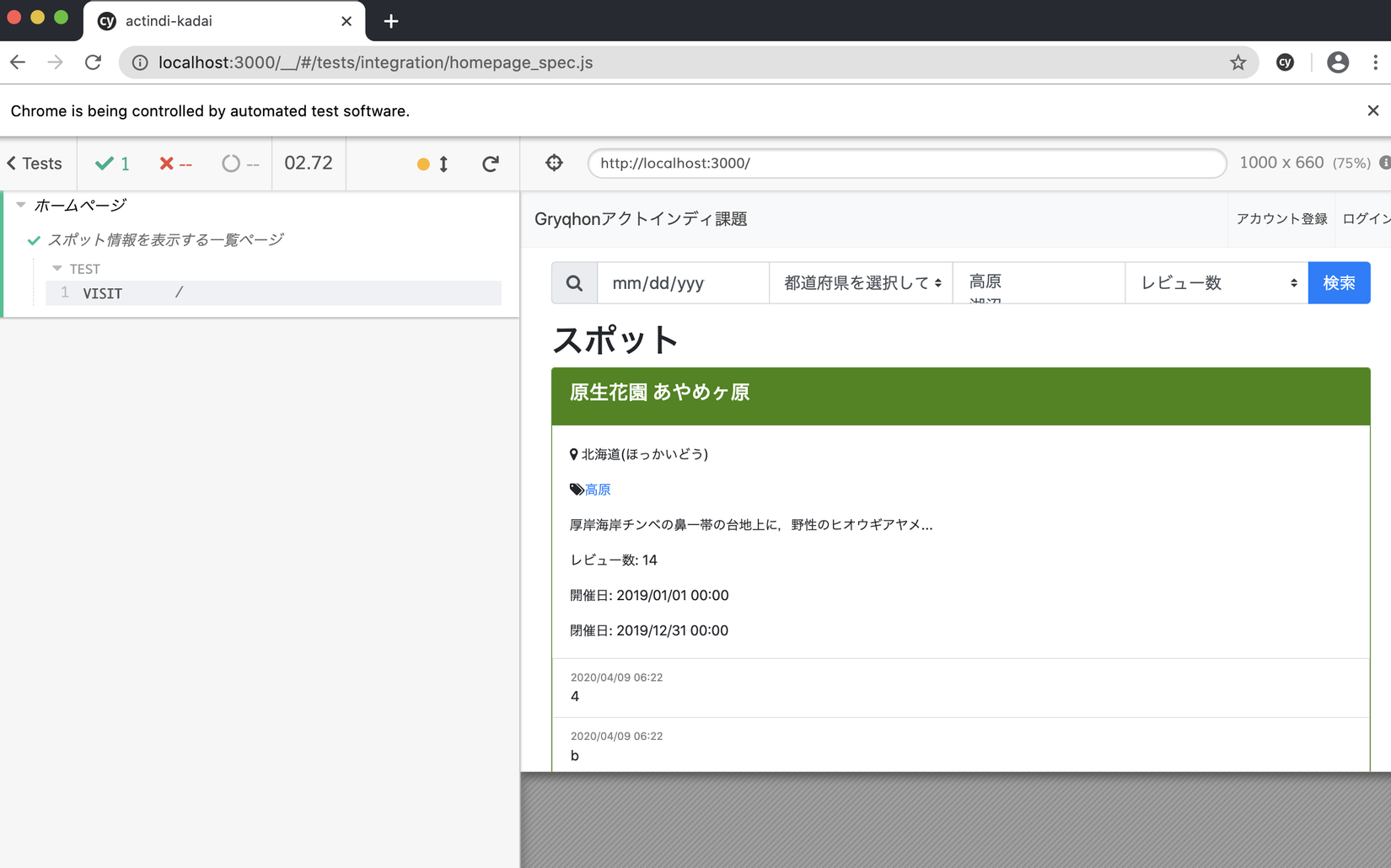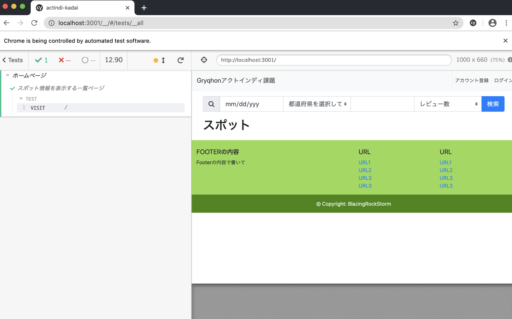 Tương tự, chạy docker-compose -f docker-compose.yml -f docker-compose.test.yml up thì sẽ link cần truy cập là localhost:3001. Lý do ở docker-compose.test.yml, lệnh khởi động rails đã có -e test và mình đặt ở port 3001. Khi đó, khởi động cypress chỉnh lại baseUrl của cypress.json là ta có kết quả