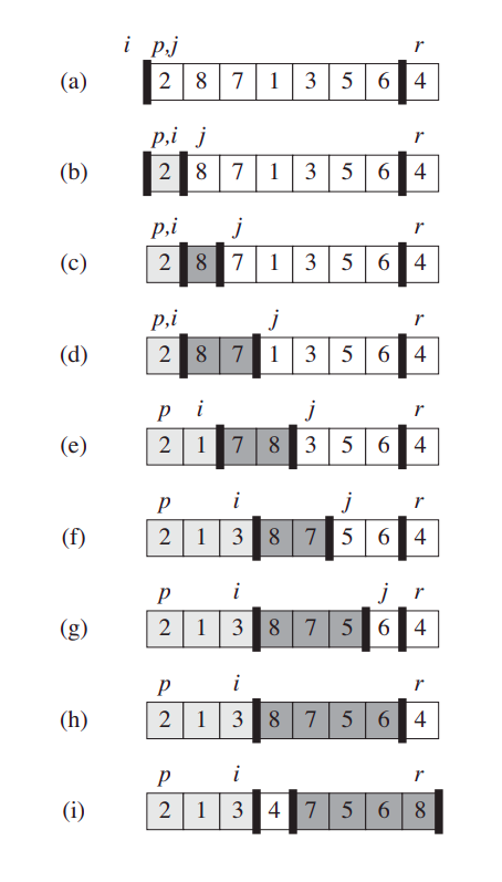 hàm Partition trên luôn lựa chọn điểm cuối mảng làm pivot ( pivot_value = A[r]) . Khi hàm chạy nó sẽ chia mảng thành 4 phần ( phần có thể không chứa phần tử nào ) . Sau mỗi lần lặp sắp xếp ta được một mảng mới có các đặc trưng sau, tại mỗi phần tử có chỉ số k bất kì thì :