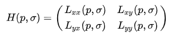 trong đó Lxx, v.v ... là tích chập của đạo hàm bậc hai của gaussian với ảnh I(x,y) tại điểm p.