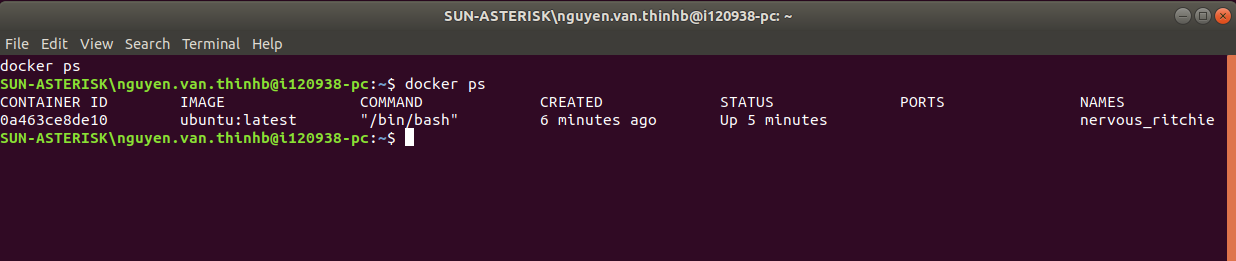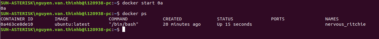 ta thấy container ubuntu mới tạo ở trên đang chạy: thông tin trên cho ta thấy container có Id 0a46... được tạo ra từ image ubuntu:latest