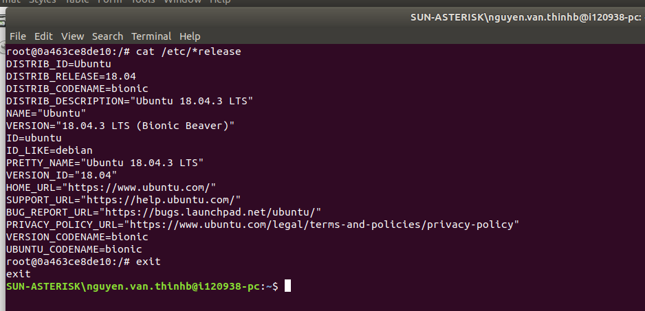 - Quay lại với terminal trong container ta thử thoát container này ra bằng lệnh