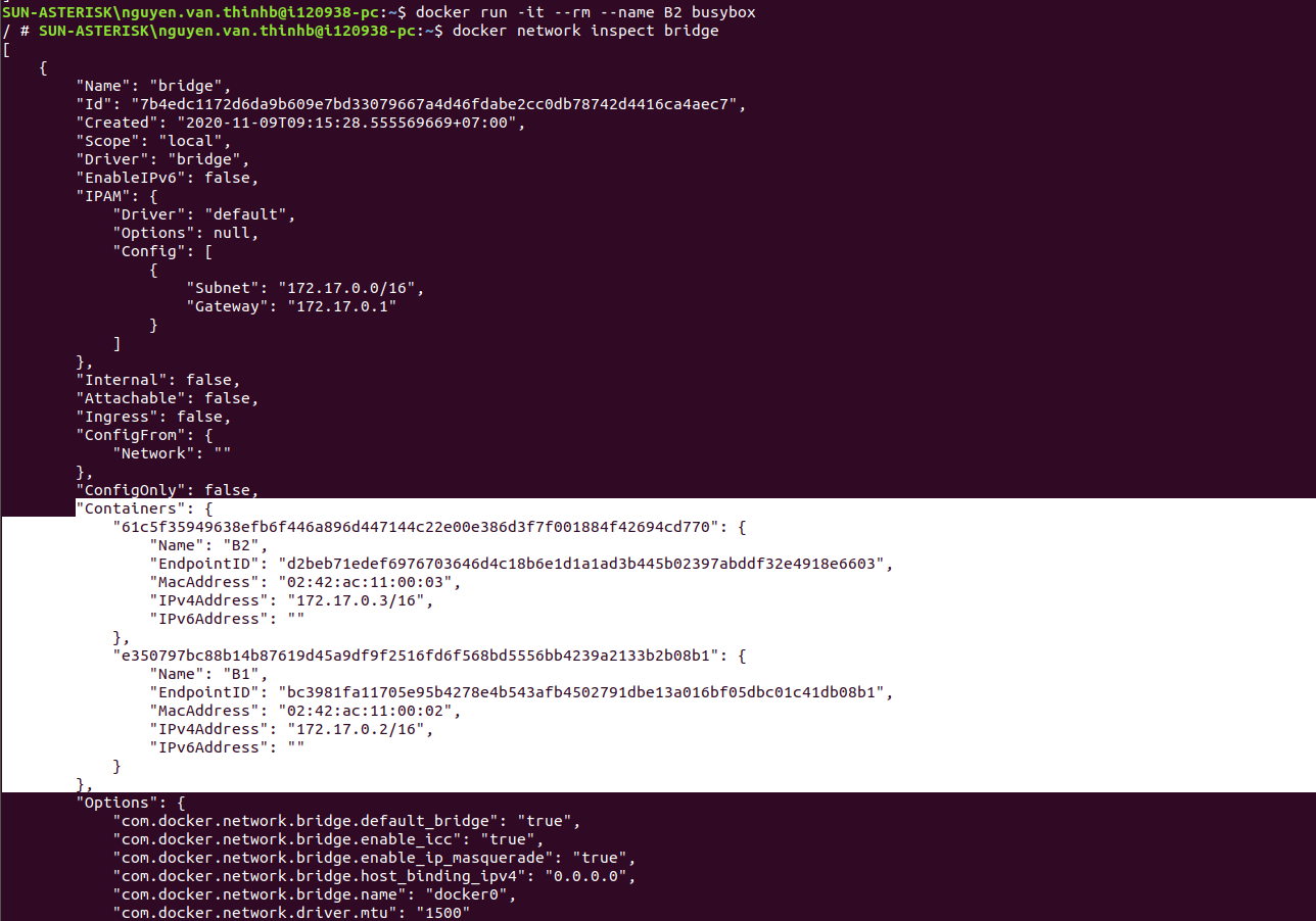 Ảnh trên ta thấy B1 có IPV4 là : 172.17.0.2 , B2 có IPV4 là: 172.17.0.3