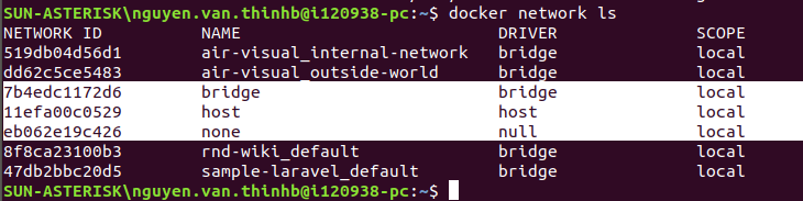 Có 3 loại networks được tự động tạo ra trong docker là bridge, none, host ta có thể xem bằng lệnh docker network ls