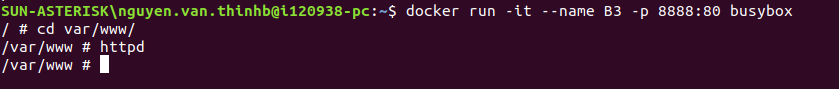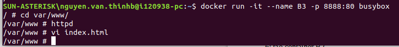 Phần thực hành này chúng ta sẽ tạo 1 container B3 từ busybox và container này có máy chủ web httpd để chạy file html, container này có cổng ánh xạ với cổng của máy host để từ máy host có thể truy cập vào máy chủ web trên container busybox này