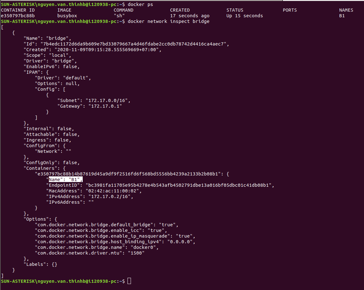 docker network inspect bridgeTa thấy B1 đã được kết nối vào mạng này