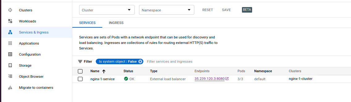 Sau khi tạo xong service, click vào Service & Ingress kết quả như bên dưới.