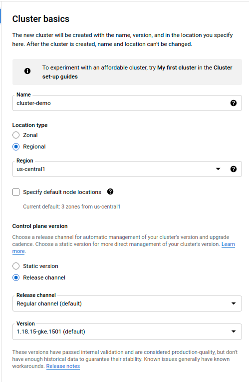 vào link này, nhấn vào create để tạo cluster, chọn loại Standard