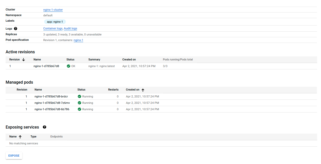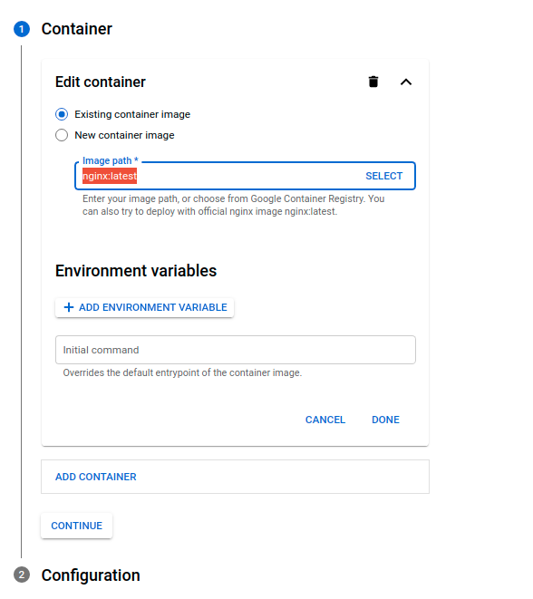 Trong ví dụ này mình sẽ sử dụng 1 images sẵn có trên repository của google cloud nginx:latest (trong thực tế, mình sẽ phải build docker image và đẩy lên).