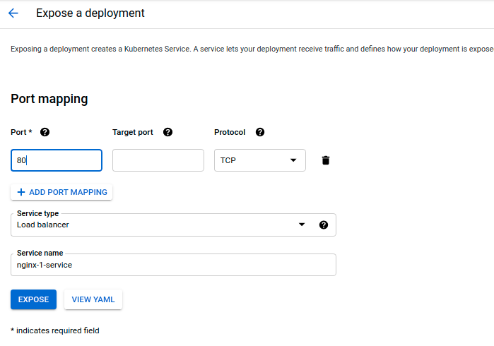 Có 2 textbox cần fill, vì nginx của mình chạy port 80 (Target Port). Ta muốn client truy cập vào port 8080 (Port). Xem chi tiết ảnh phía trên.