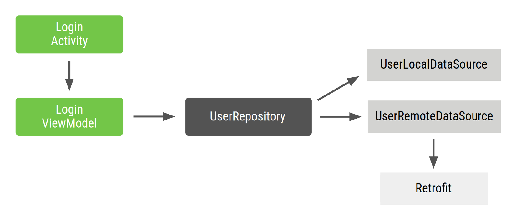 Với màn hình Login, LoginActivity phụ thuộc vào LoginViewModel, Mà LoginViewModel lại phụ thuộc vào Repository. Sau đó Repository lại phụ thuộc vào UserLocalDataSource và UserRemoteDataSource rồi lần lượt phụ thuộc vào Retrofit như biểu đồ bên dưới đây: