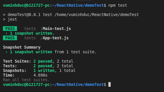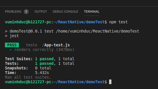 Sau khi tạo project (hoặc setup cơ bản với những phiên bản RN < 0.38) thì chúng ta đã có thể chạy test thông qua lệnh npm test.