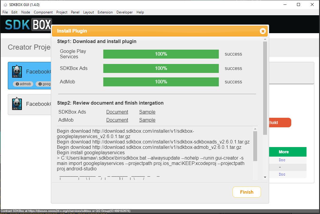- Cuối cùng sau vài hôm chạy kiểu đó ko thấy gì mình mới xem lại cách anh em cài bằng tay SDKBox, rồi mình cài qua commandline, 1 phát ăn luôn, quay lại bật trong Cocos Creator thì không báo update nữa mà ngon lành luôn! bịp thế là cùng