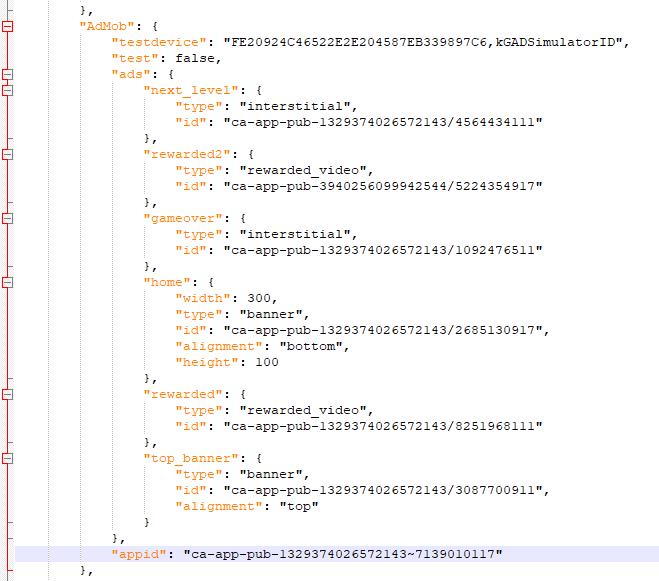 - Sửa các id theo thông tin trên tài khoảng admob các bạn đã tạo:
