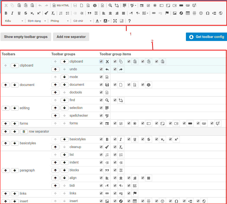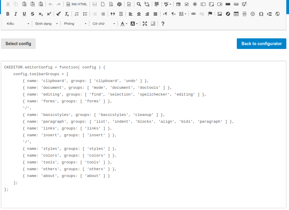 Oke khi thay đổi xong các bạn sẽ ấn vào Get toolbar config để lấy ra nội dung như bên dưới vào paste vào code sử dụng là oke.